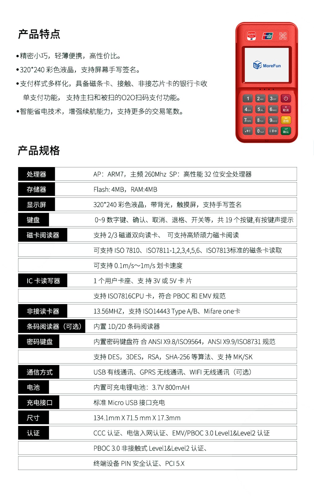 首页>>安徽产品中心>>安徽手持无线POS 安徽电银支付-4G+扫码枪 高配版 * 性能优越:32位高性能ARM11安全CPU;整机通过业内更先进的PCI PED4.X 安全认证及国内受理终端PIN输入设备安全评估检测认证,多项措施保障金融交易的安全;* 时尚外观:外形小巧携带方便,高抗跌落性能、宽工作温度、防水防尘设计、外壳坚固耐刮、户外携带式作业更加耐久可靠。* 通讯备份:支持2G-3G扩展;* 超长续航:3.7V-800毫安稳定续航能力,智能电池管理保证持续工作18小时,待机72小时。 标准配置 返 回